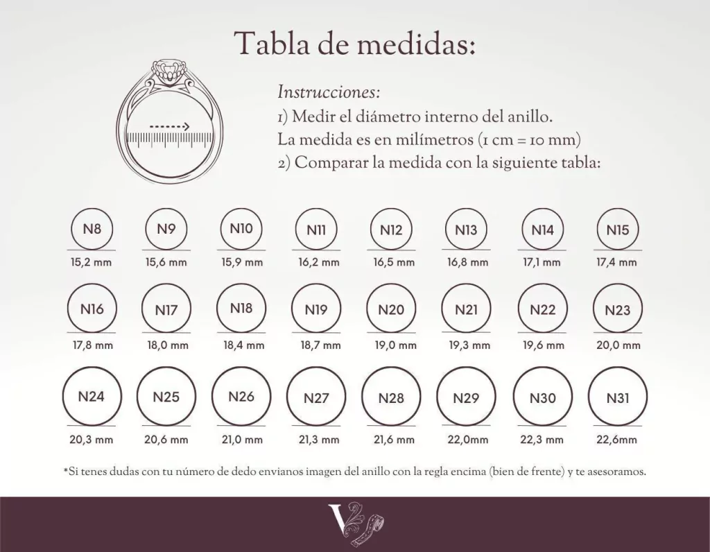 Para asegurarte de que las alianzas calcen perfecto, podés consultar nuestra "Tabla de Medidas" deslizando las imágenes en el carrusel. Allí explicamos cómo medir la circunferencia y encontrar la talla adecuada. Además, estamos a tu disposición para guiarte paso a paso por mensaje si lo necesitás.
