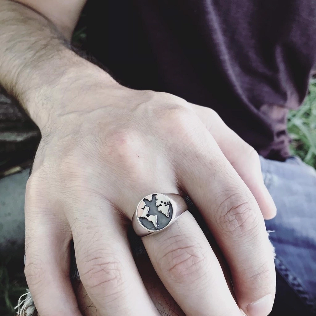 Anillo de plata 925 con diseño de mapa mundi, cuidadosamente hecho a mano para quienes llevan el amor por los viajes grabado en la piel. Cada pieza es única y refleja la pasión por descubrir el mundo.