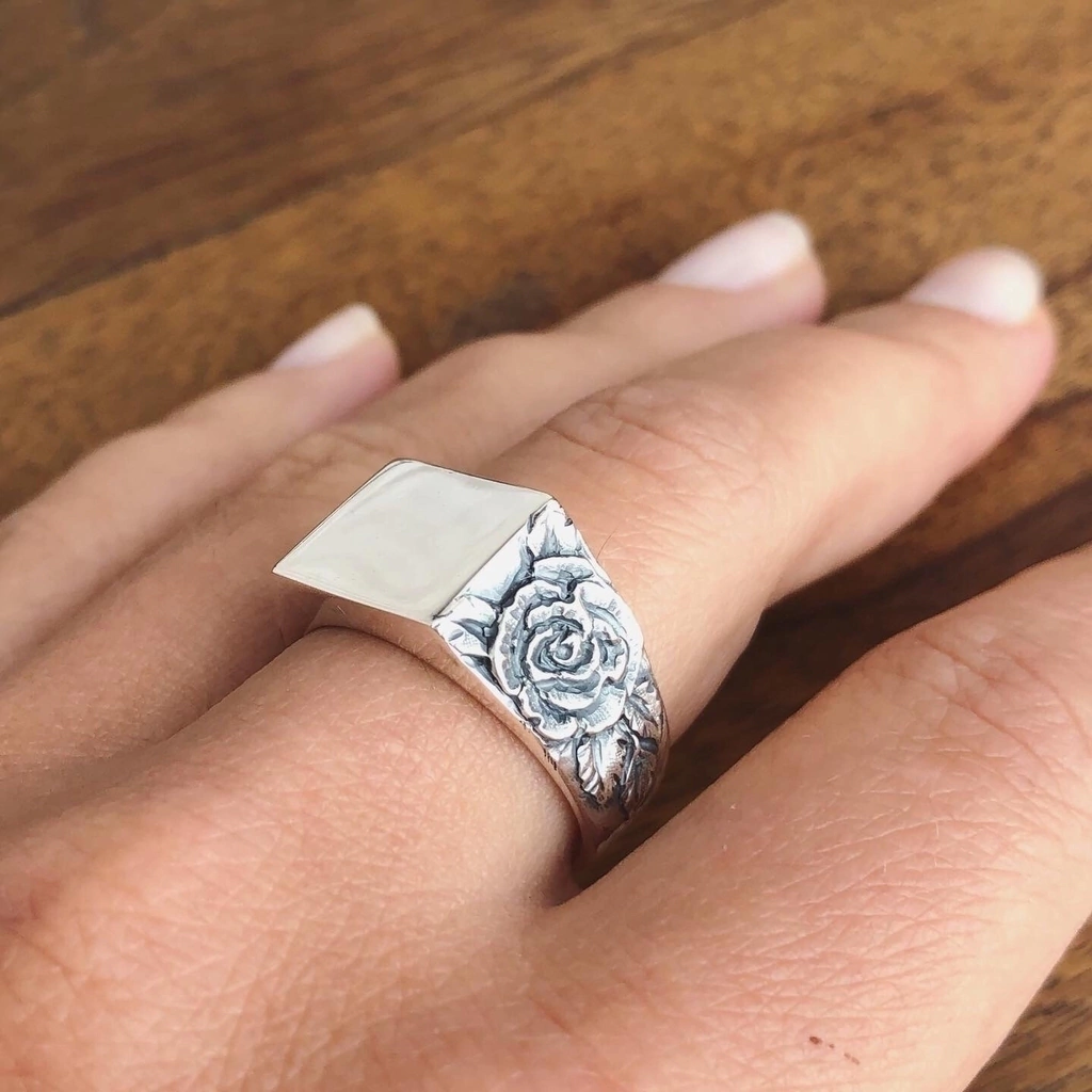 Un anillo con carácter y sensibilidad. Esta pieza artesanal está cincelada a mano, y presenta un diseño de rosas en relieve que combina fuerza y delicadeza. Además, permite personalizarse grabando una inicial en el frente, lo que la convierte en una joya aún más especial para regalar o llevar con significado propio.
