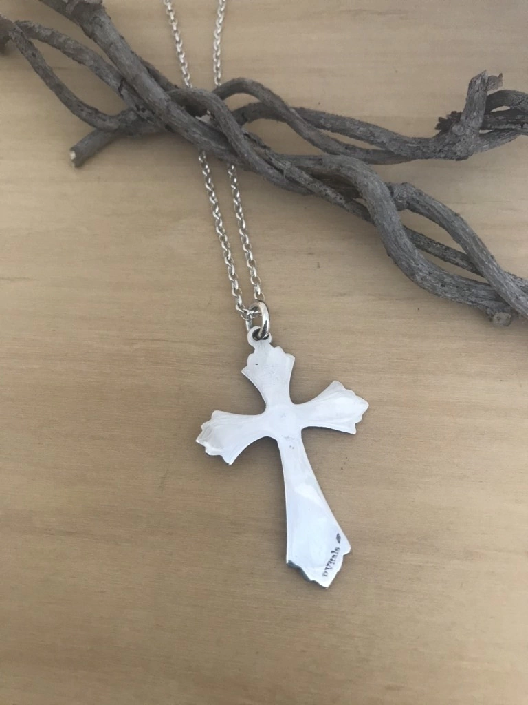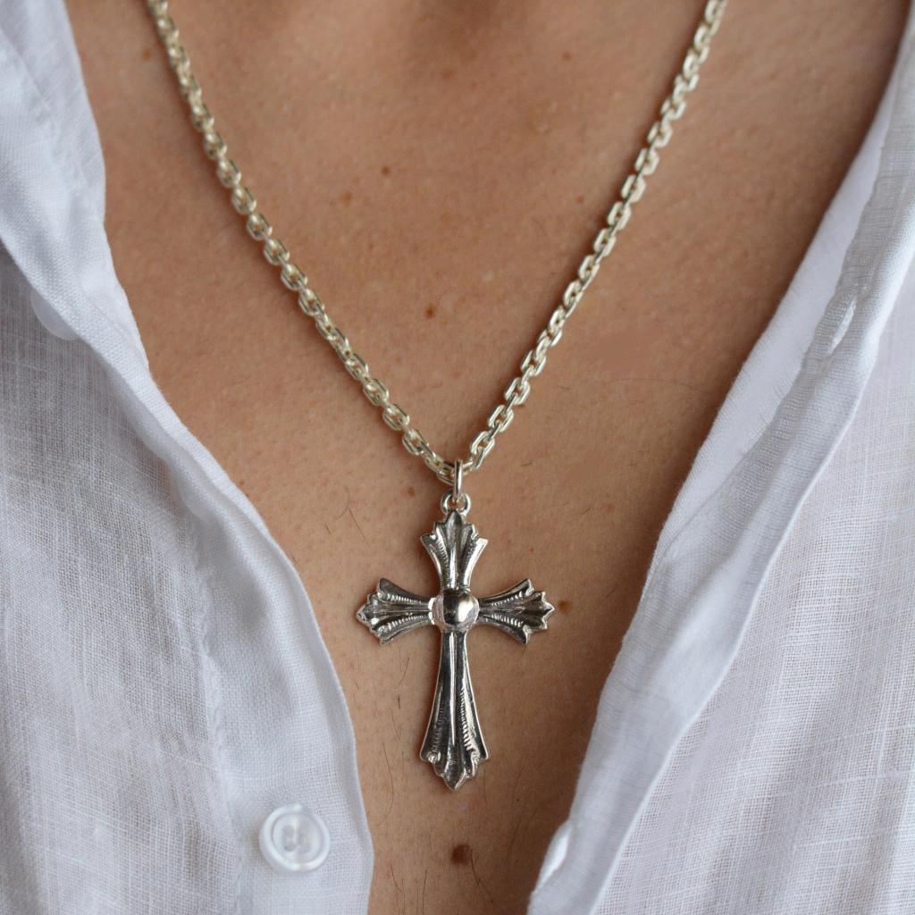 Cada detalle de esta cruz unisex ha sido cuidadosamente trabajado mediante la técnica tradicional de cincelado a golpe de martillo y cincel, garantizando una pieza única y exclusiva. Más que un accesorio, es un símbolo de fe y protección que podés llevar con vos todos los días.