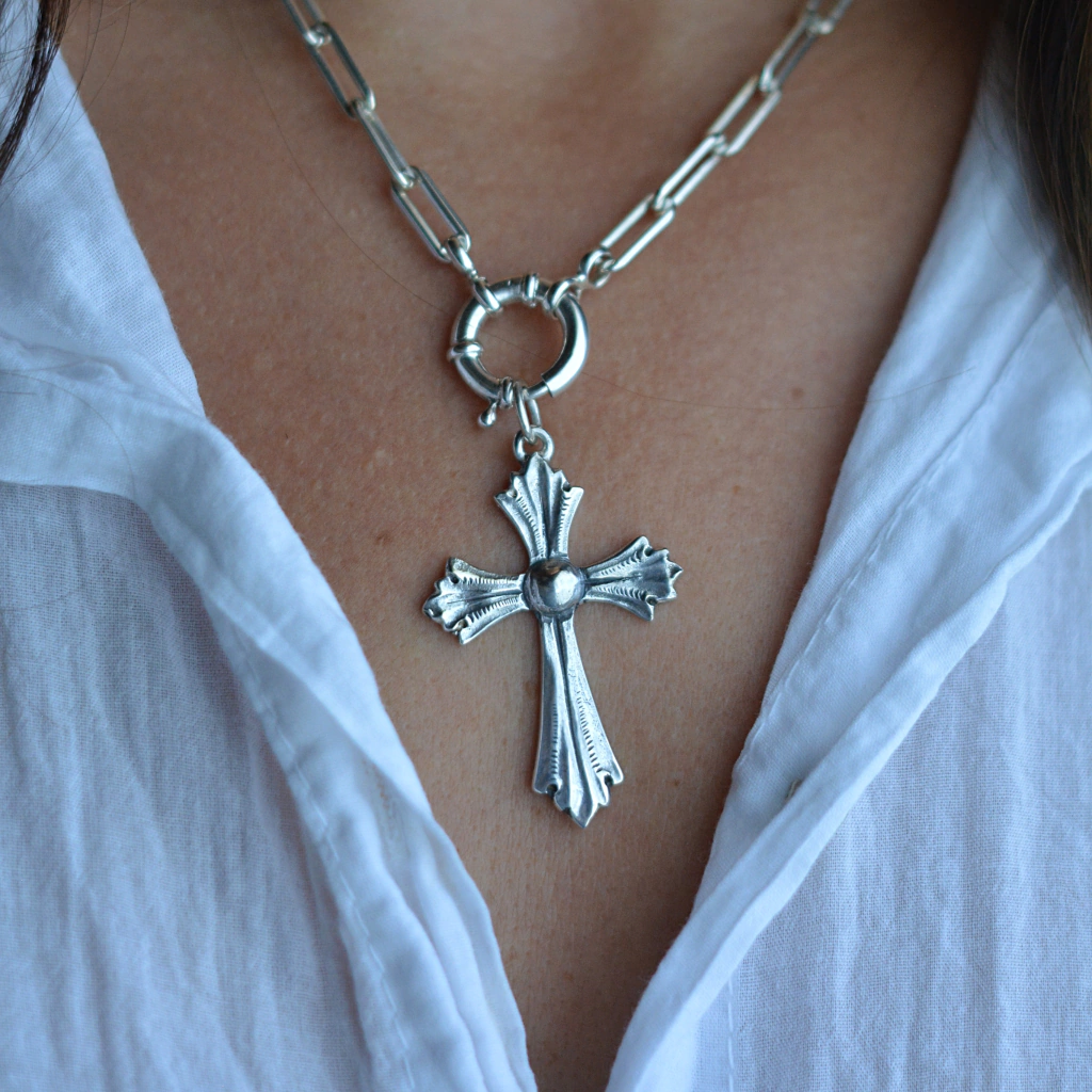 Colgante Cruz Acanto: una joya artesanal de plata 925 cincelada a mano que encarna la elegancia y la tradición del estilo barroco. Inspirado en motivos clásicos, este colgante presenta delicadas hojas de acanto que le otorgan un aire sofisticado y de gran porte, ideal para quienes buscan una pieza con presencia y significado.