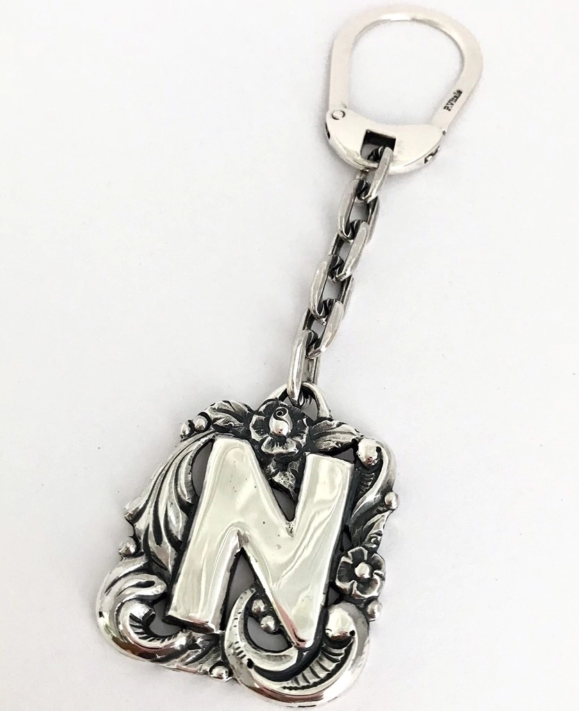 Diseño de inicial central rodeada de flores y hojas. Este modelo se cincela totalmente a mano convirtiéndolo en una pieza única. Cada flor se modela a golpe de martillo y cincel, en un trabajo laborioso de paciencia y delicadeza.